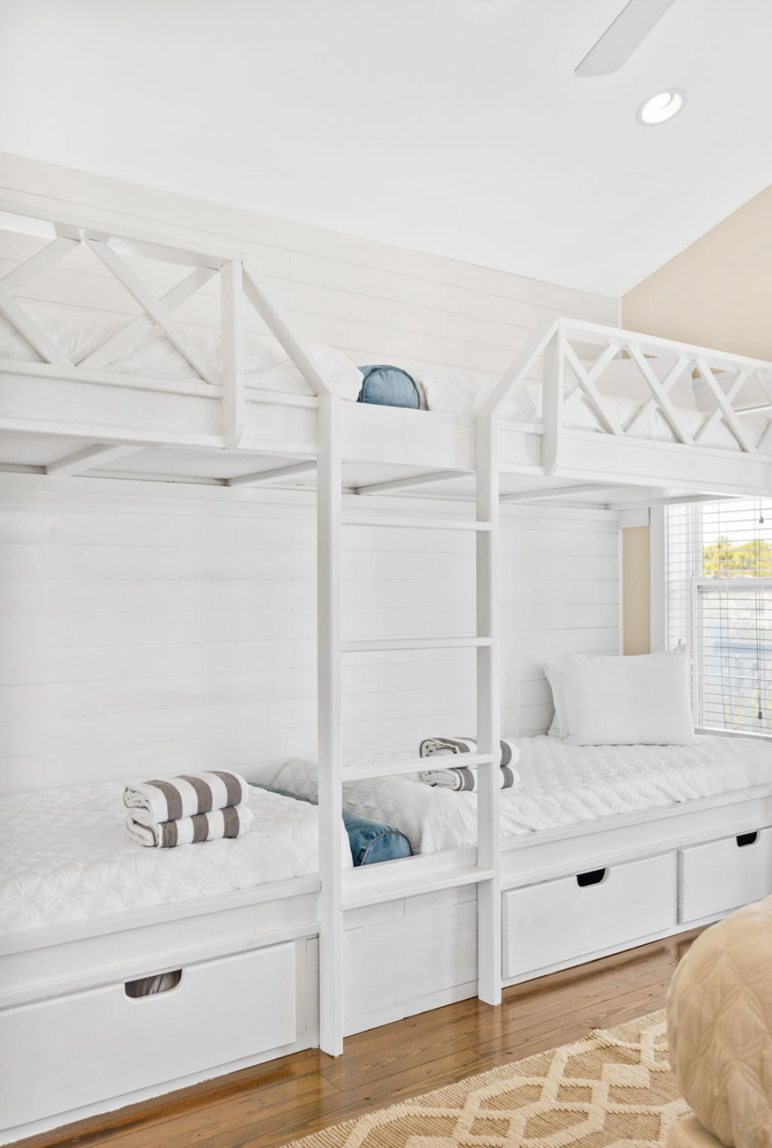 * 3rd Floor: Queen bed + 4 built-in twin XL bunks, private bath & wet bar