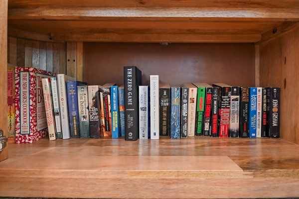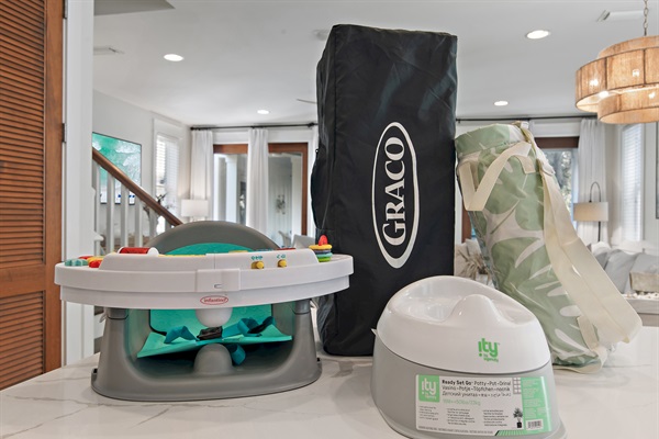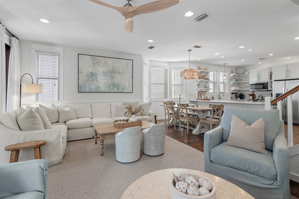 A plush sectional sofa and accent chairs provide plenty of seating for movie nights or afternoon lounging, while large windows fill the room with warm Gulf sunshine.