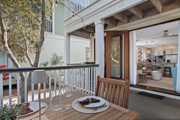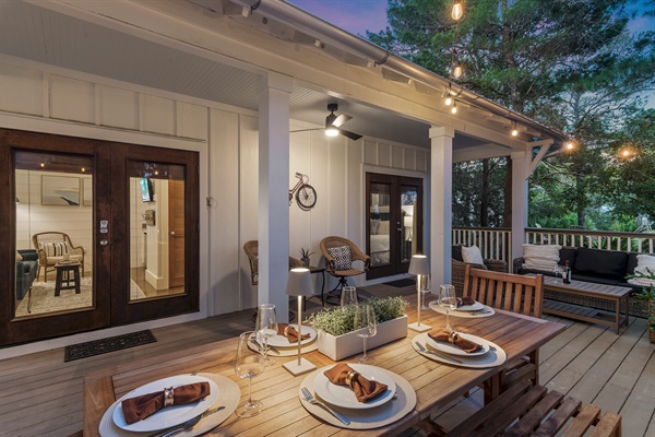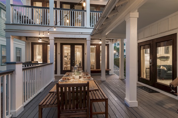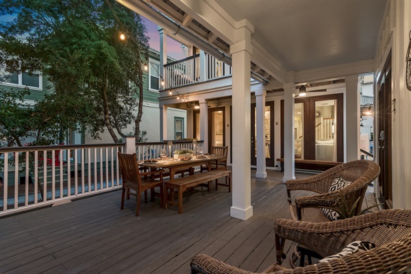 The spacious porch is softly lit by glowing string lights, creating the perfect setting for evening dinner and conversations.