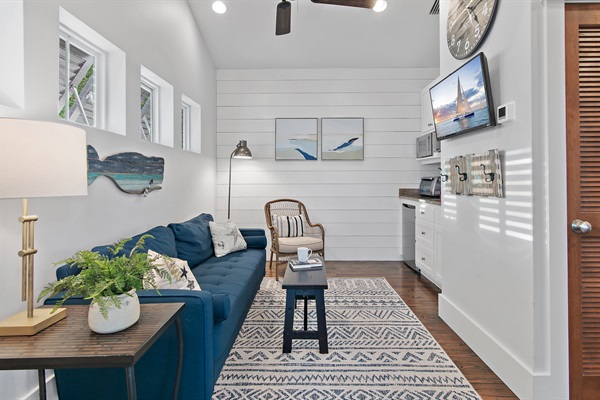 Enjoy morning coffee or sunset drinks on your private balcony with peaceful views of the charming beachside neighborhood.